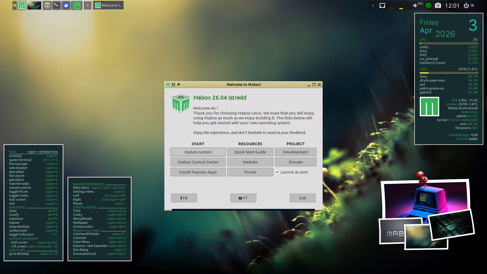 After first boot you will see Mabox Welcome screen.