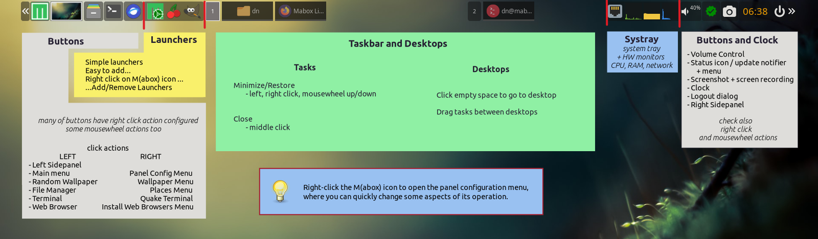 - educational — presenting keyboard shortcuts: mabox tools, PCManFM, Tiling terminal
