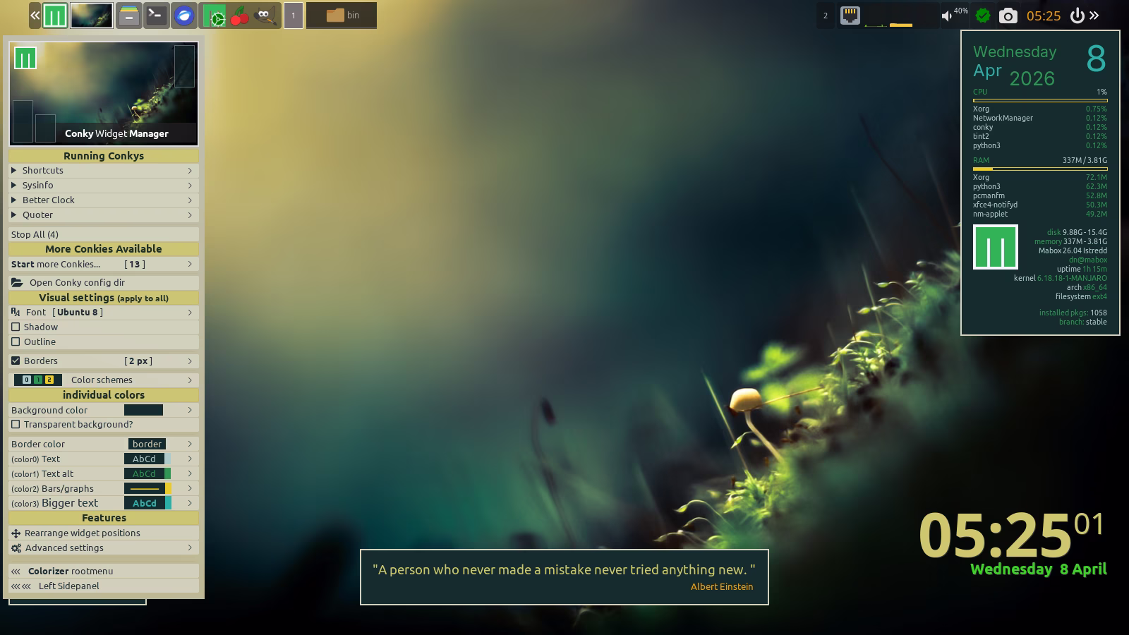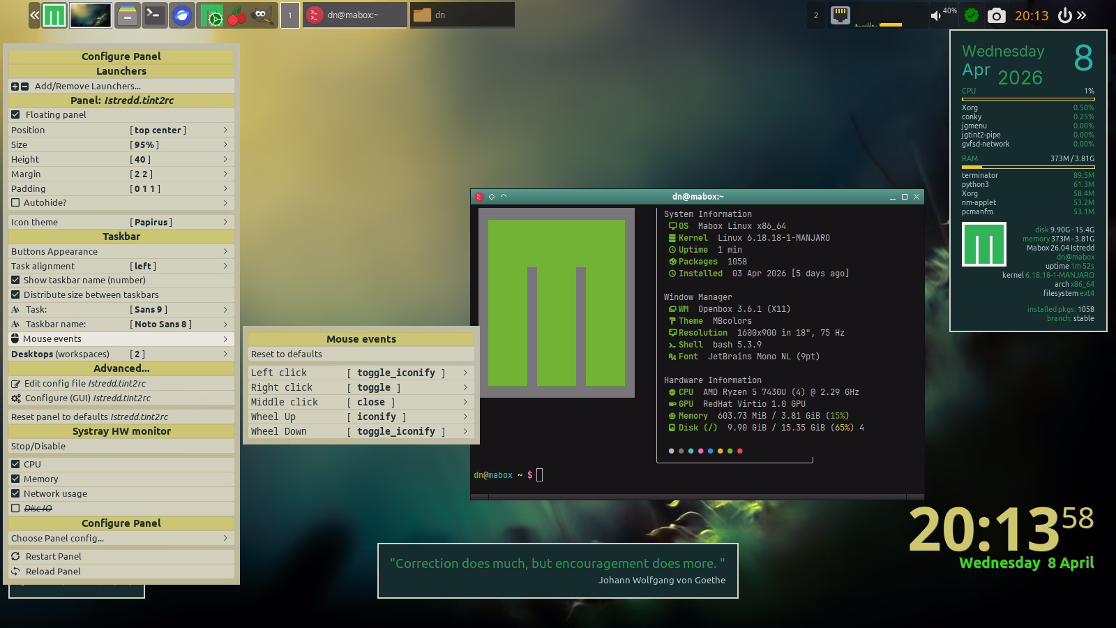 The tint2 panel can be customized to your needs using the menu located under the M icon on the panel (right‑click). The menu can also be opened with the shortcut W‑A‑p.